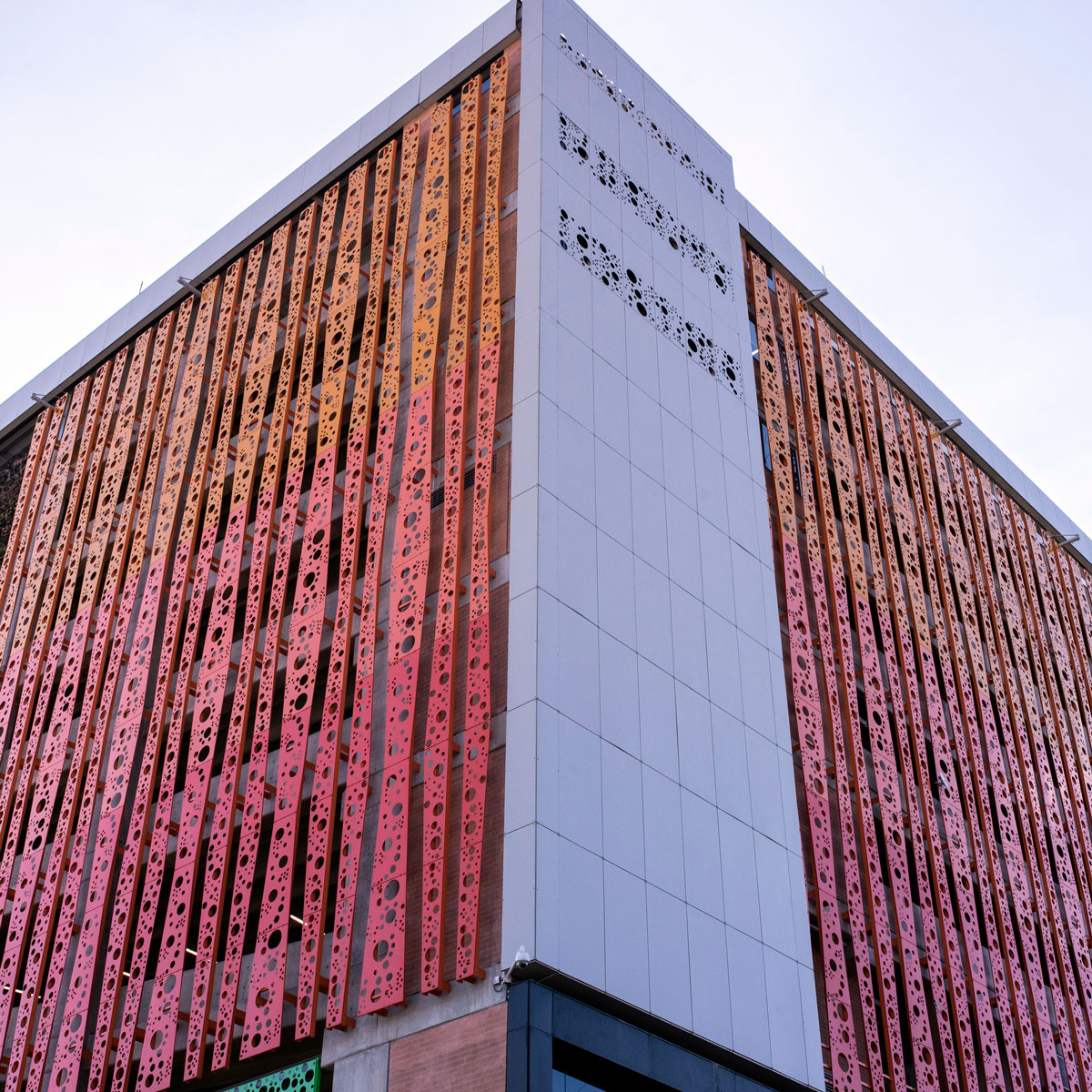 El uso de este tipo de paneles se convierte en una solución innovadora para el revestimiento de fachadas, ya que controlan la penetración de la luz, lo que permite que el edificio regule la temperatura interior; Su diseño facilita la circulación de aire de un lugar a otro, los orificios se pueden personalizar según sea necesario, es liviano y fácil de mantener porque es resistente a la corrosión.
